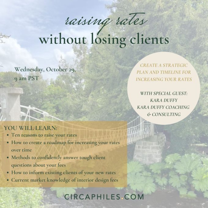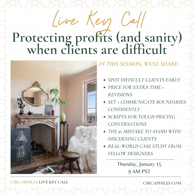 ZoomHOW TO PROTECT PROFIT WHEN CLIENTS ARE HIGH-TOUCH, HIGH-DEMAND, OR INDECISIVE Before you roll full speed into January, let’s pause and talk about something that can take a big toll on designers: pricing—especially when clients are high-touch, high-demand, or endlessly indecisive. Those clients often cost more than we anticipate. So how do we protect our […]