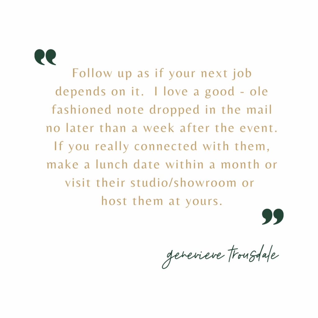 Follow up as if your next job depends on it. Meeting someone at an event and getting their business card is great, but that relationship won’t lead to anything if you don’t follow up.  I drop a good – ole fashioned note in the mail no later than a week after the event. If you really connected with them, make a lunch date within a month or visit their studio/showroom or host them at yours.